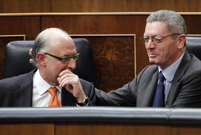 ECO41. Madrid, 13/03/2012.- El ministro de Justicia, Alberto Ruiz Gallardón (d), saluda hoy, martes 13 de marzo de 2012, al ministro de Hacienda, Cristobal Montoro, al término del discurso que sobre presupuestos ha pronunciado el último en el Congreso de los Diputados. EFE/ MANUEL H. DE LEÓN