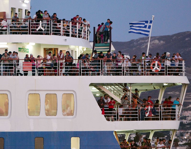 Syrian refugees stand aboard the Eleftherios Venizelos liner which will serve for their registration and as housing facility for some migrants in the port of Kos late on August 18, 2015. Authorities on the island of Kos have been so overwhelmed that the government sent the ferry to serve as a temporary centre to issue travel documents to Syrian refugees.The nearly full liner departed on early on August 19, to collect migrants from nearby island and take them all to the northern greek city of Thessaloniki. AFP PHOTO /LOUISA GOULIAMAKI 4638#Agencia AFP